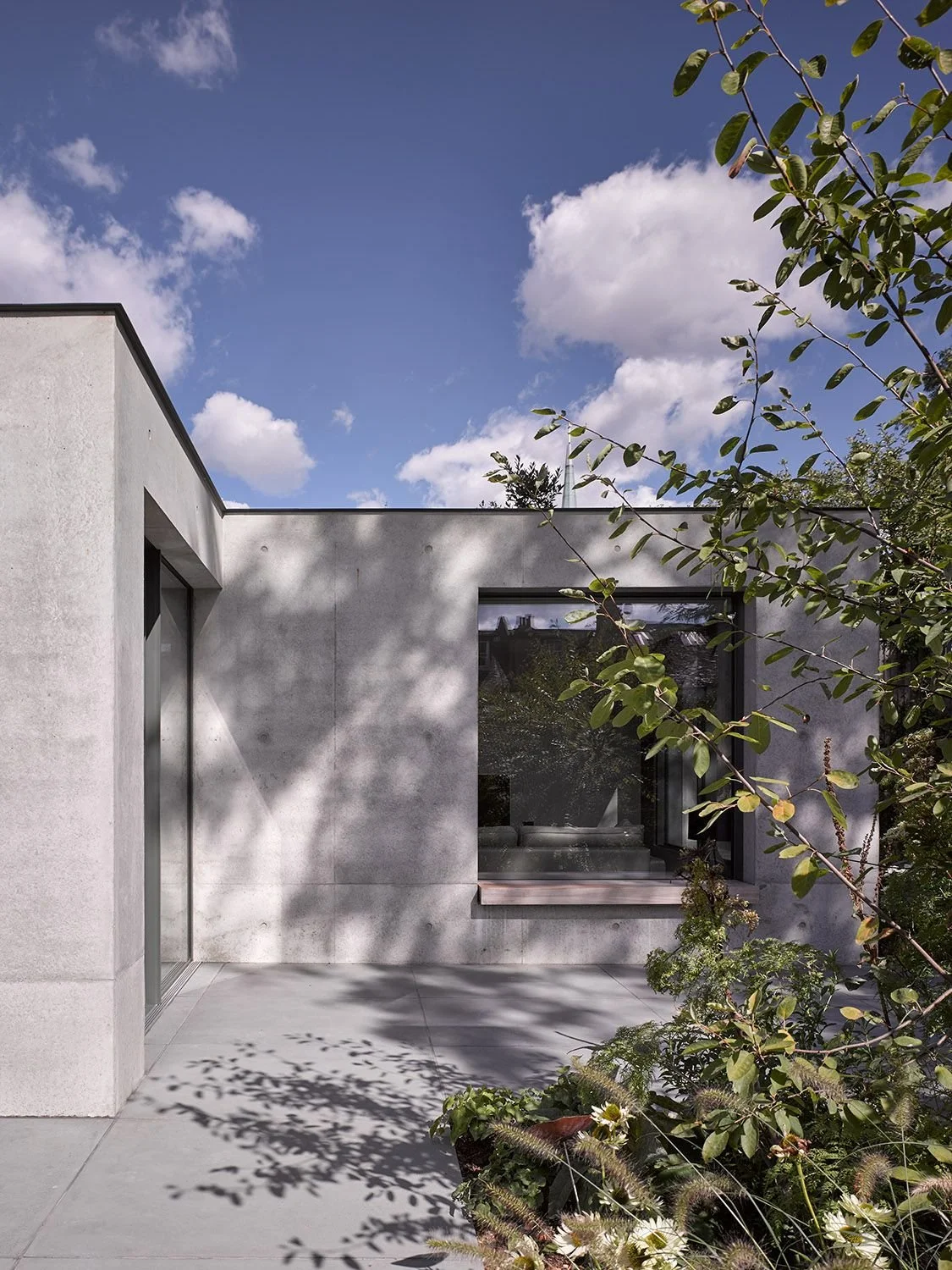 The essence of this project is a ‘screen’ wall of monolithic concrete. Its form encloses a courtyard garden, a contemporary hortus conclusus, hidden from neighbours’ windows and with its own sheltered microclimate. Built for a family of sun-worshippers to take advantage of the south facing aspect, the concrete acts as a heat sink to prolong the daytime warmth into the evening.